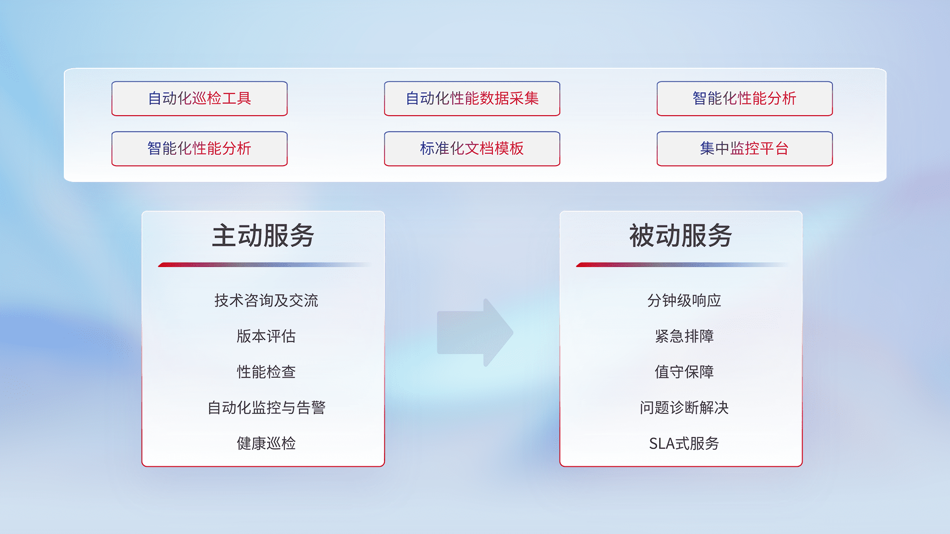 智能化工具和标准化文档,,,,保障服务质量,,提供主动服务(包含技术咨询、、、版本评估、、、、性能检查、、自动化监控与告警、、、健康巡检)和被动服务包含(分钟级响应、、、紧急排障、、、、值守保障、、问题诊断解决、、、SLA服务)。。。